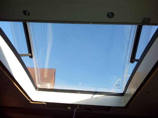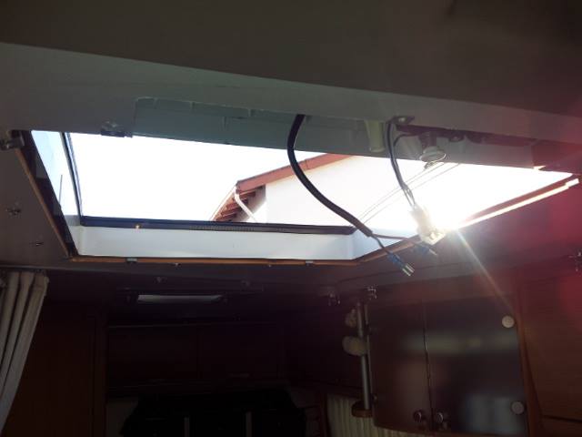 Das Dach gründlich unter Wasser gesetzt und den Innenrahmen von der undichten Dachluke entfernt. Meiner Frau habe ich eine Pressluftpistole in die Hand gedrückt und bin dann auf das Womo-Dach geklettert. Jetzt hat meine Frau mit der Druckluft gegen die Dachluke geblasen und ich konnte ganz deutlich sehen, wo die Luftblasen nach außen kamen. Das Ganze noch gefilmt und ab zur Werkstatt. Die waren von dieser Diagnostik hell begeistert und haben es auch gleich nochmal ausprobiert. Das Ergebnis war eindeutig, und der Schaden wurde behoben.