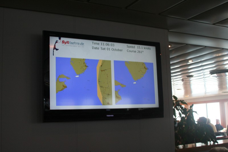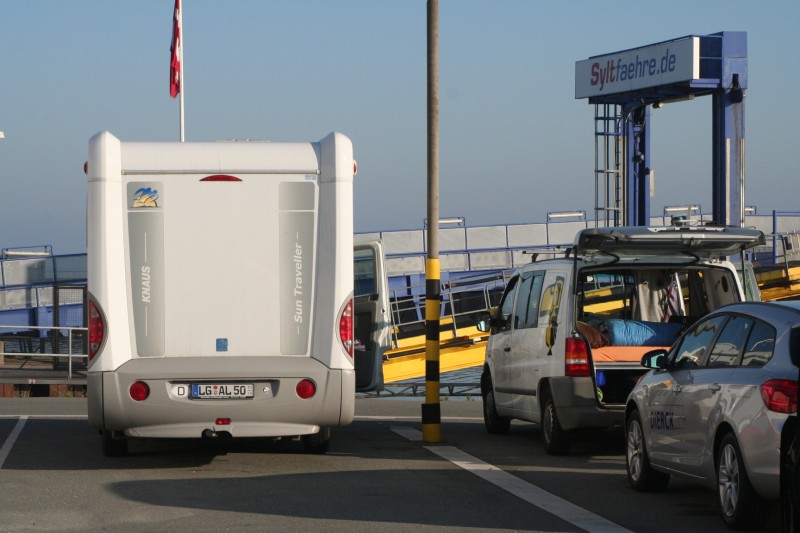 Neben einem LKW, einigen Bussen waren wir mit einigen Wohnmobilen und einer Vielzahl von PKW an Bord der Syltfähre. Diese Fähre ist 2005 erneuert worden und es hat sich so einiges zu der alten Fähre geändert. Mehr Komfort in jedem Fall. Kurz nach der Abfahrt heulten die ersten Alarmanlagen im unteren Bereich auf. Die Überfahrt zur Insel Sylt war bei dem traumhaften Wetter ein Genuß.