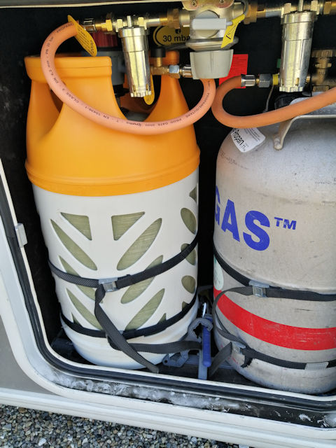 Die dänischen Kunststoffflaschen sind zwar höher als unsere Alugas Flaschen, aber mit etwas Übung bekomme ich sie doch gut in das knauserische Gasfach.